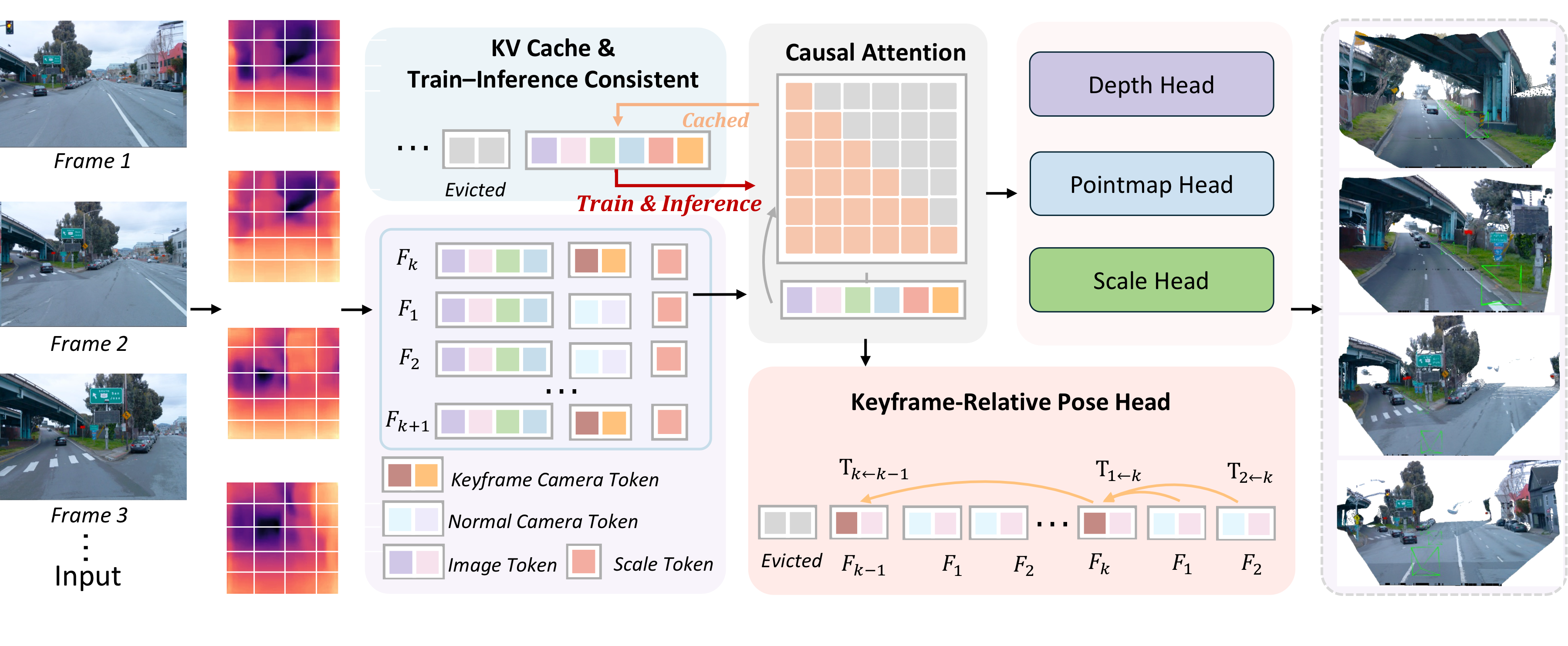Given streaming inputs, patch tokens are extracted by a ViT encoder and augmented with keyframe, normal-frame, and scale tokens. Tokens are fused via causal attention with a shared KV cache, which is consistently used in both training and inference for cache-consistent streaming modeling. The network predicts keyframe-relative poses Ti←k, depth, pointmap, and global scale, enabling stable metric-scale reconstruction over long sequences.